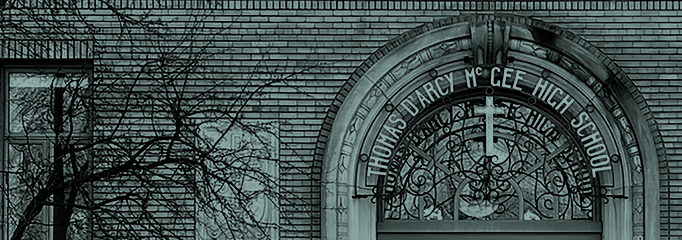 The imposing building on the corner is home to Thomas D'Arcy McGee High School, which opened in 1931. Imagine hundreds of students chatting, laughing and shouting, right here, each morning. At first, this English-language Catholic school caters mainly to the local Irish community. Successive waves of immigration gradually change the composition of the student population. Finally, a sharp drop in attendance leads to the school's closure in 1992.